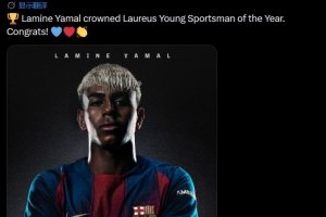 巴萨官方写道:“拉明·亚马尔荣膺劳伦斯年度最佳青年运动员奖。祝贺!”